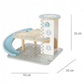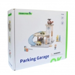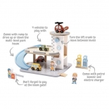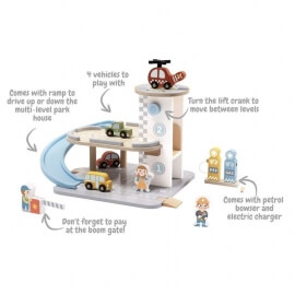 Το γκαράζ διαθέτει 2 επίπεδα στάθμευσης που συνδέονται με πλαστική ράμπα για ομαλή κύλιση, σταθμό ανεφοδιασμού με αντλίες βενζίνης και φόρτισης, ελικοδρόμιο με ελικόπτερο, καθώς και πλούσια αξεσουάρ όπως πινακίδες κυκλοφορίας, μπάρα ελέγχου και ξύλινες φιγούρες. Περιλαμβάνονται επίσης 3 ξύλινα αυτοκίνητα και 3 φιγούρες εργαζομένων για άμεσο παιχνίδι.