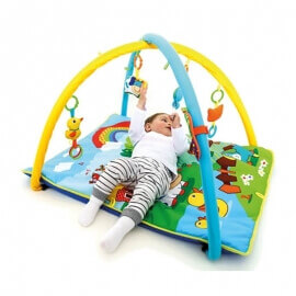 Βρεφικό γυμναστήριο - πάπλωμα δραστηριοτήτων Spielmaus. Έχει χαρούμενα χρώματα και περιλαμβάνει 4 κρεμστά ζωάκια, τα οποία μπορούν να κρεμαστούν με διάφορους τρόπους. Τα ζωάκια είναι κατασκευασμένα με διάφορα υλικά και υφές, ώστες να διεγήρουν τις αισθήσεις του μωρού κινήσουν το ενδιαφέρον του μωρού να τα εξερευνήσει.