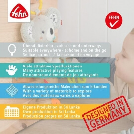 - Πρακτική στερέωση: χάρη στον πρακτικό κρίκο ανάρτησης, το κρεμαστό παιχνίδι δραστηριοτήτων προσαρμόζεται εύκολα σε καρότσια, βρεφικά καθίσματα ή κούνιες