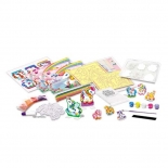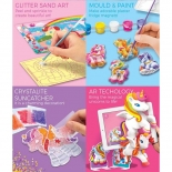 ΠΕΡΙΕΧΟΜΕΝΑ: 1 καλούπι με 6 σχέδια, 1 σακουλάκι γύψο σε σκόνη, 1 πλαστική λωρίδα με μαγνήτες, 5 διαφορετικά χρώματα, 1 πινέλο, 2 αυτοκόλλητα προσχέδια μονόκερων, 2 πλαίσια εικόνας, 6 γκλίτερ άμμου, 1 διαφανή παλέτα, 4 συσκευασίες χρωματιστών χαντρών, 1 κόλλα, 1 κορδόνι, 1 πρότυπο με 6 κάρτες μονόκερων. Περιέχονται οδηγίες στα Ελληνικά.