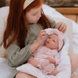 Νεογέννητο μωρό βινυλίου 40 εκ Reborn Alba. Είναι σαν αληθινό! Έχει λεπτομέρειες στο δέρμα και στο πρόσωπο και τα νύχια, ζωγραφισμένες στο χέρι και υπέροχα μάτια από γυαλί. Φορά ροζ ρουχαλάκια και ασόρτι κορδέλα. Περιλαμβάνει μαλακό πάπλωμα-μαξιλάρι από ποιοτικά υλικά, πιπίλα με κλιπ, πάνα και πιστοποιητικό αυθεντικότητας. Είναι ισπανικό, τα άκρα του και το κεφάλι είναι κατασκευασμένα από μαλακό βινύλιο, ενώ έχει μαλακό πάνινο σώμα. Αναδύει απαλό άρωμα βανίλιας.